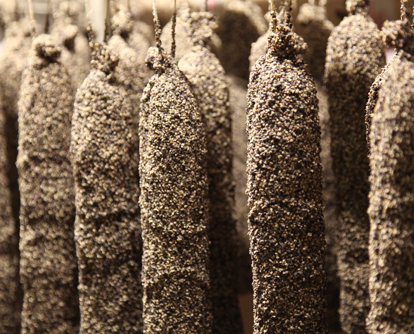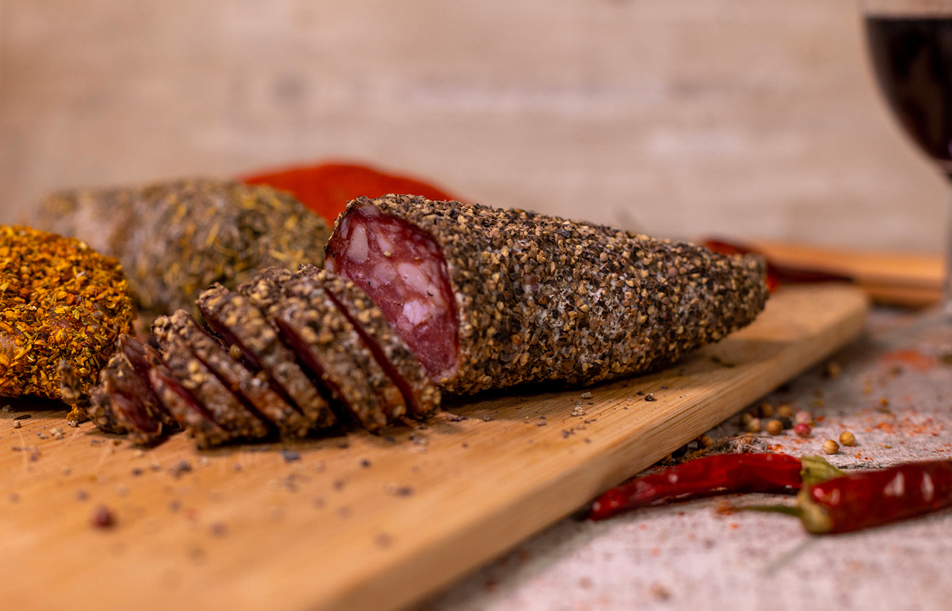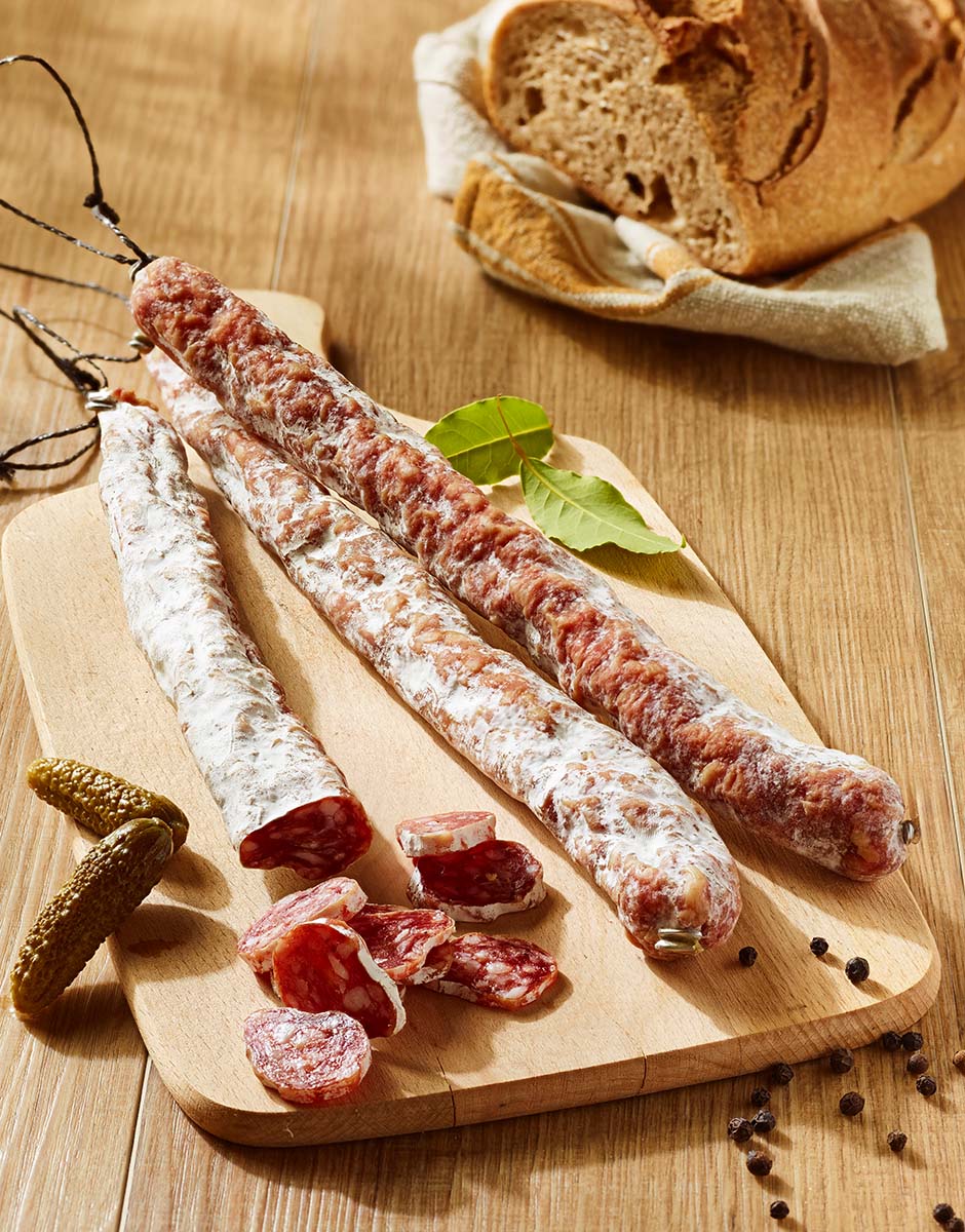 La sélection rigoureuse des viandes, l’assaisonnement spécifique à chaque recette et l’utilisation majoritaire de boyaux naturels témoignent de cet engagement pour la qualité. Attachée à la tradition, elle perpétue un savoir-faire artisanal : une grande partie des saucissons sont encore bridés à la main, préservant ainsi les techniques et gestes d’antan.