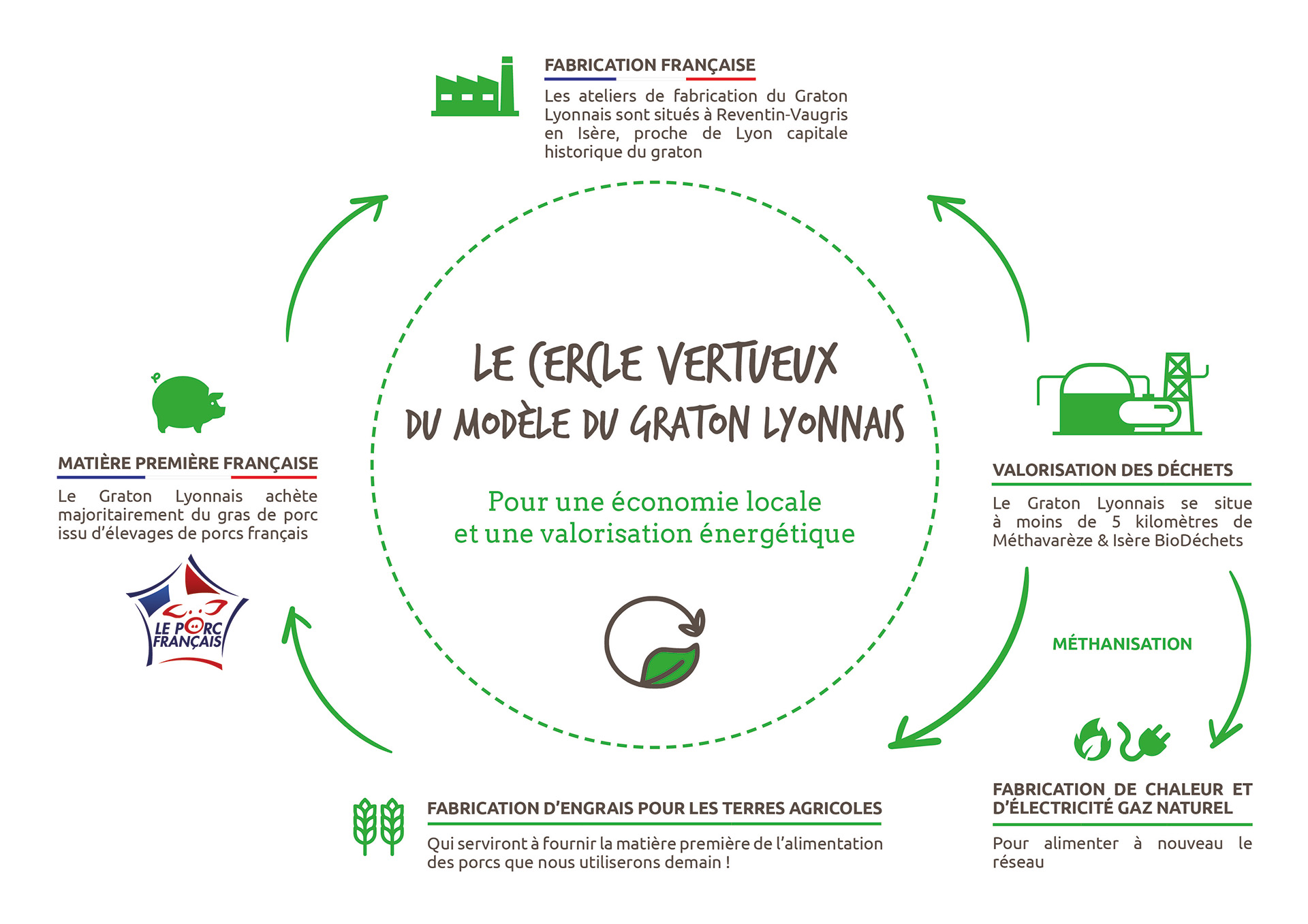 Mais aussi une réduction de l’emprunte carbone grâce à l’optimisation logistique en réduisant fortement les distances de transport de déchets : le Graton Lyonnais se trouve à moins de 5 kilomètres de Méthavarèze & Isère BioDéchets. - UN ENJEU D’ÉCONOMIE CIRCULAIRE en intégrant la transformation des déchets comme dernier maillon de son modèle vertueux 100% local. Ici les ressources sont utilisées de manière efficace et durable.